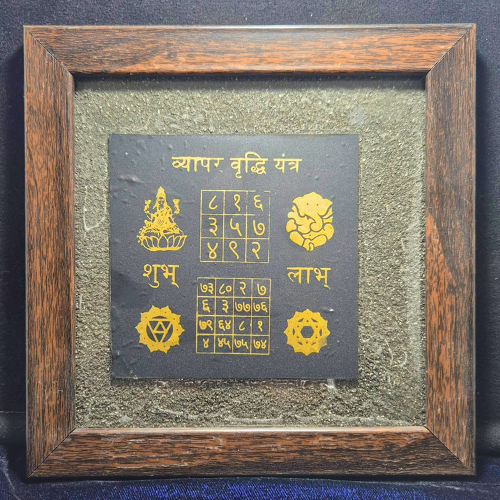 The Vyapar Brudhhi Yantra is a sacred geometric diagram that invokes divine blessings for success and profit in business. When crafted with Pyrite dust, it gains additional energy to manifest abundance, attract clients, and remove financial blockages. The wooden frame adds grounding energy, maintaining balance and stability in your work environment.