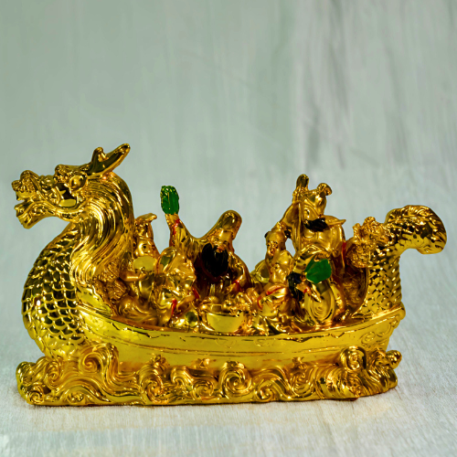 A Dragon Ship depicts a golden or metallic vessel adorned with a dragon head — symbolizing leadership, wealth, and courage. In Feng Shui, the Dragon Ship carries treasures, gold coins, or gems, representing a smooth flow of financial success and opportunities sailing into your life.