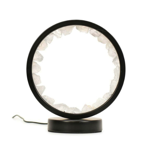These are premium light frames embedded with natural Clear Quartz stones, arranged around a glowing LED ring. The combination creates a decorative yet healing lighting element that: